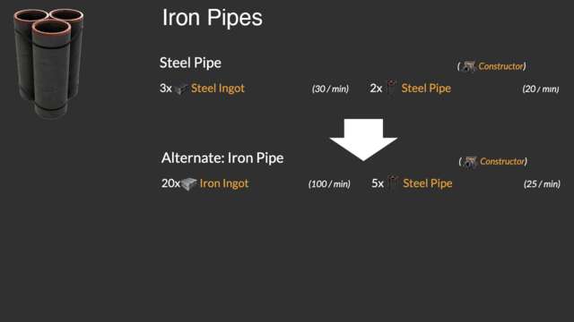 Iron Pipes aren’t a huge leap in efficiency, going from 20 steel pipes per minute to 25 Iron pipes. But what’s important here is the ingredient change. Steel Ingots, just like Iron, end up going into lots of different components once you get going, and Iron pipes give you the option to shift to something you might have an excess of–Iron Ingots.