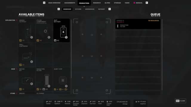 One more thing to bear in mind is that you can choose to “uphold” a certain number of items. This means an item will always be crafted up to that minimum amount as long as you have the necessary resources. Perhaps the most crucial item is the Radiation Filter, which is needed in the Machinery room, since it prevents the deadly radiation from harming anyone inside the base.