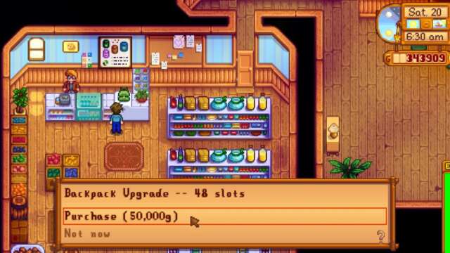 We’ve addressed the issue of not being able to access your chests anywhere on the map, but what about the increasing frustration of having a limited inventory on your person? Sure, you could move things between chests using the Chests Anywhere mod above, but the Bigger Backpack mod goes one further. Simply head to Pierre’s and part with 50,000g to get a backpack with 48 slots. While your inventory starts at 12 slots, it can be upgraded in the vanilla game to 36. But what good is 36? We want 48!