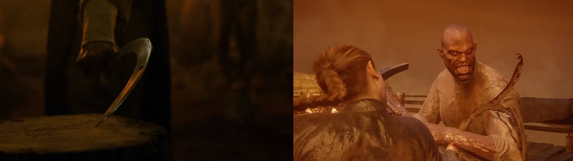 The Last of Us Part 2 is consistently incredibly violent, even by its predecessor’s standards, and 20 seconds into the teaser we get our first look at a bladed sickle weapon, which presumably belongs to one of the Seraphites. Also known as Scars, this cult-like faction from the game favors more workman-like weaponry such as hammers, machetes, bows, and, in this case, sickles. This may seem like a really tenuous detail, but this specific tool of destruction (or harvesting if that’s more your speed) plays a key role late in The Last of Us Part 2’s story. In a brutal showdown with a pickaxe-wielding Seraphite heavy, Abby achieves bloody victory with a Sickle, tearing apart the Seraphite’s face in a sequence that’s frequently harrowing.