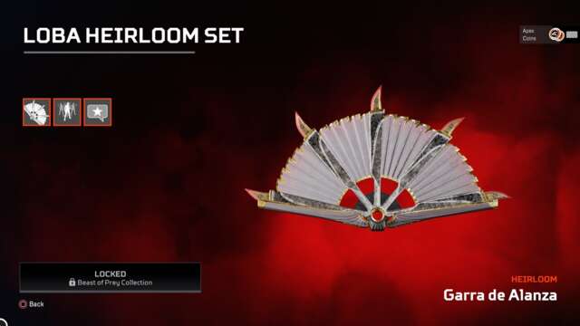 Loba’s Heirloom weapon, the Garra de Alanza, is the reward for unlocking all 24 Beast of Prey Collection Event cosmetics.