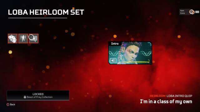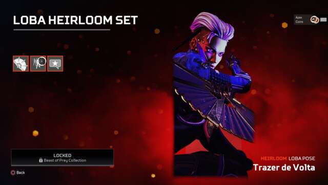 Collecting all 24 cosmetics–either by paying to directly unlock each one, unlocking them via crafting metals, or purchasing Beast of Prey Apex Packs for 700 Apex Coins ($7 USD)–will earn you the Garra de Alanza (“Claw of Alanza”), Loba‘s new Heirloom weapon. The folding fan is a replica of one owned by Loba’s late mother, Alanza Andrade. Loba has modified the fan to have sharp, claw-like blades that she uses to slice up her foes.