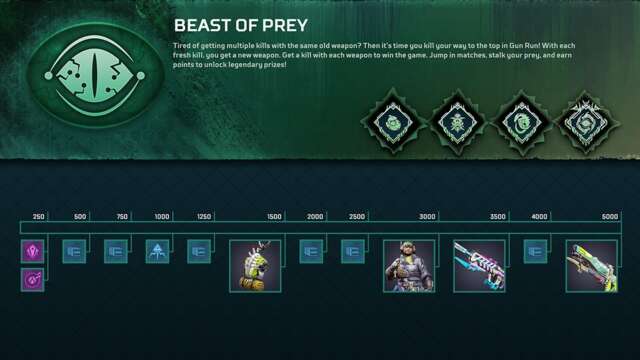 But premium cosmetics and pricey Heirloom weapons aren’t all the Beast of Prey event has to offer–there’s also a free reward track. It includes the following items: