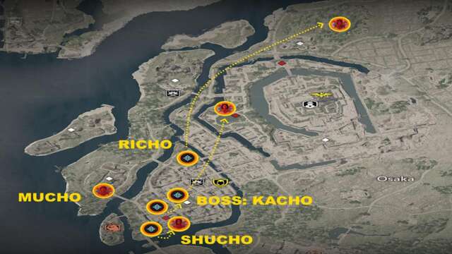 The map above shows the locations of the Assassin’s Creed Shadows Butterfly Collector targets. As you can see, there are four targets with their own mini-quest chains that lead to other areas of Osaka: