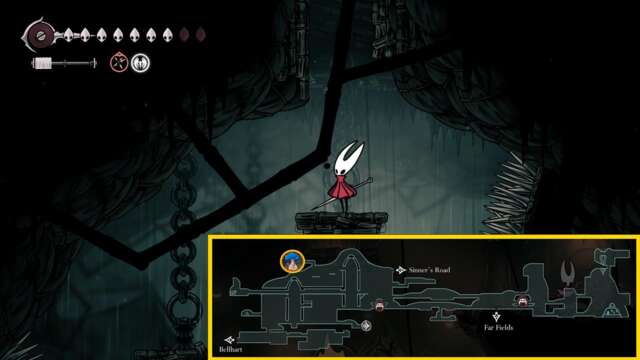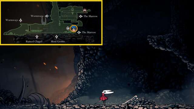 In any case, make your way to the top-left section of Greymoor by pogoing and double-jumping to avoid the spikes. The ceiling has a pathway that leads to Wisp Thicket. The patch of ground with the mushrooms is off to the side.