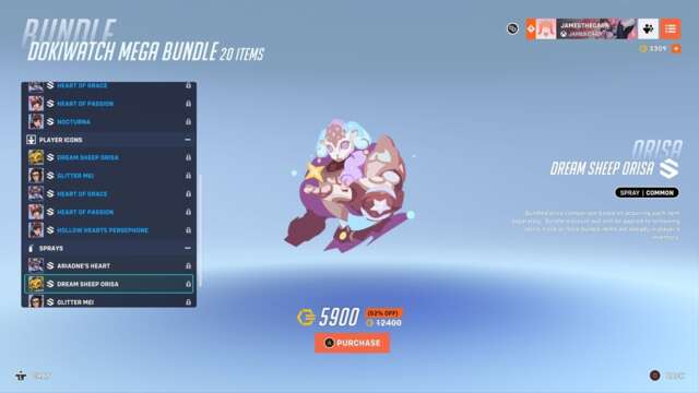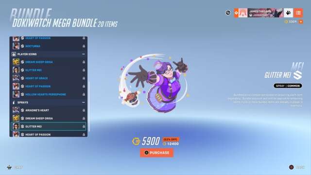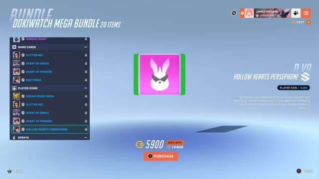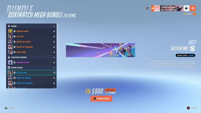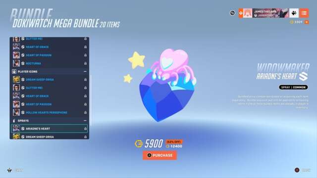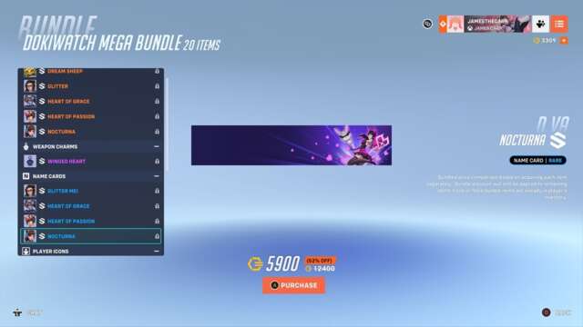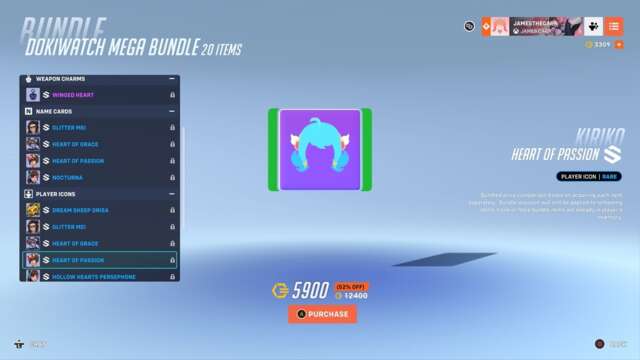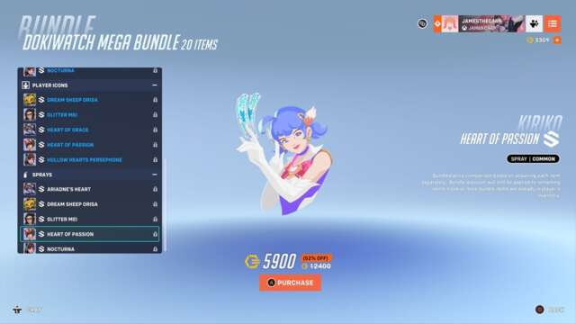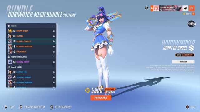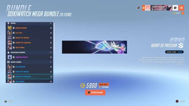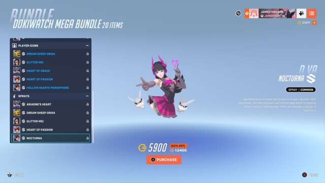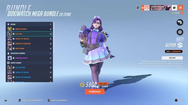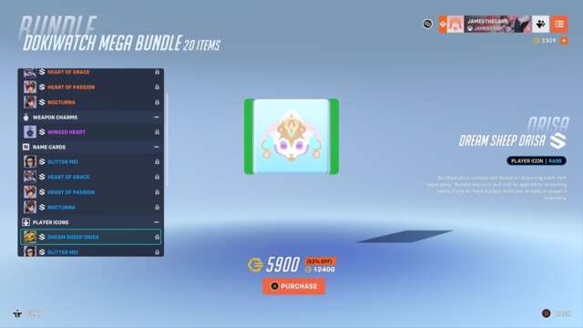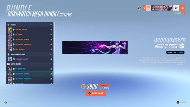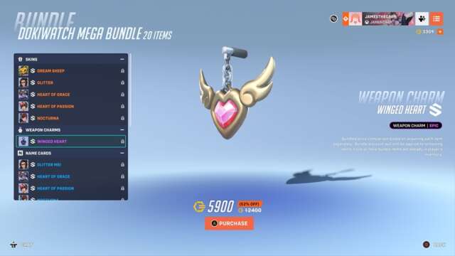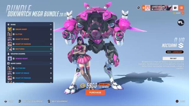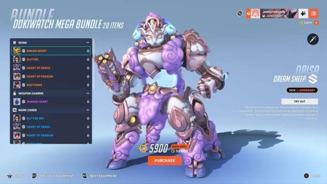 The main Dokiwatch Mega bundle on the store costs 5,900 coins (about $60), and includes five skins: Dream Sheep Orisa, Glitter Mei, Heart of Grace Widowmaker, Heart of Passion Kiriko, and Nocturna D.Va. The bundle also includes name cards and player icons, but these five skins can be purchased individually for 1,900 coins directly in the hero gallery. However, there are a few more Dokiwatch skins to get elsewhere in Overwatch 2.