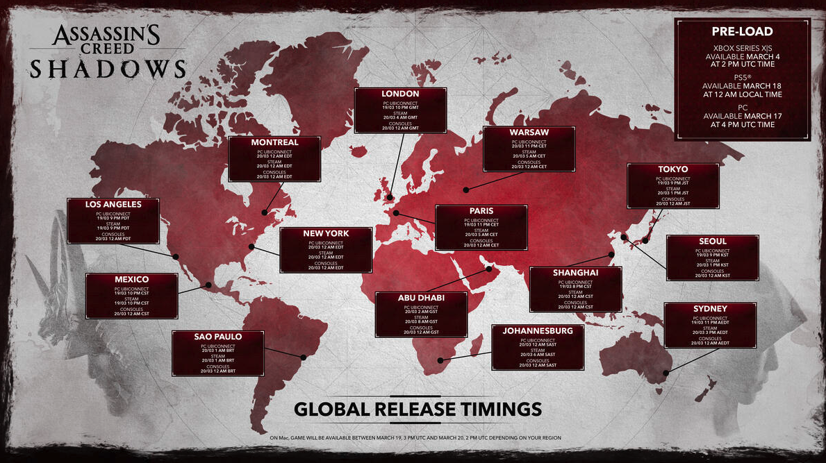 Assassin’s Creed Shadows launches on March 20, and now Ubisoft has announced precisely when people can get started by publishing the game’s global releasing timing. Ubisoft also announced that pre-loading for Shadows is now underway on Xbox and will start soon for PS5 and PC.