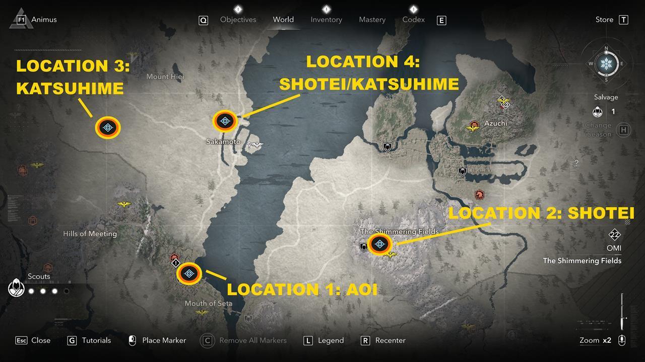 The map above shows the locations of Katsuhime, Aoi, and Shotei in Assassin’s Creed Shadows. All of these characters are in the region of Omi in the northeastern part of the map. Here’s the gist: