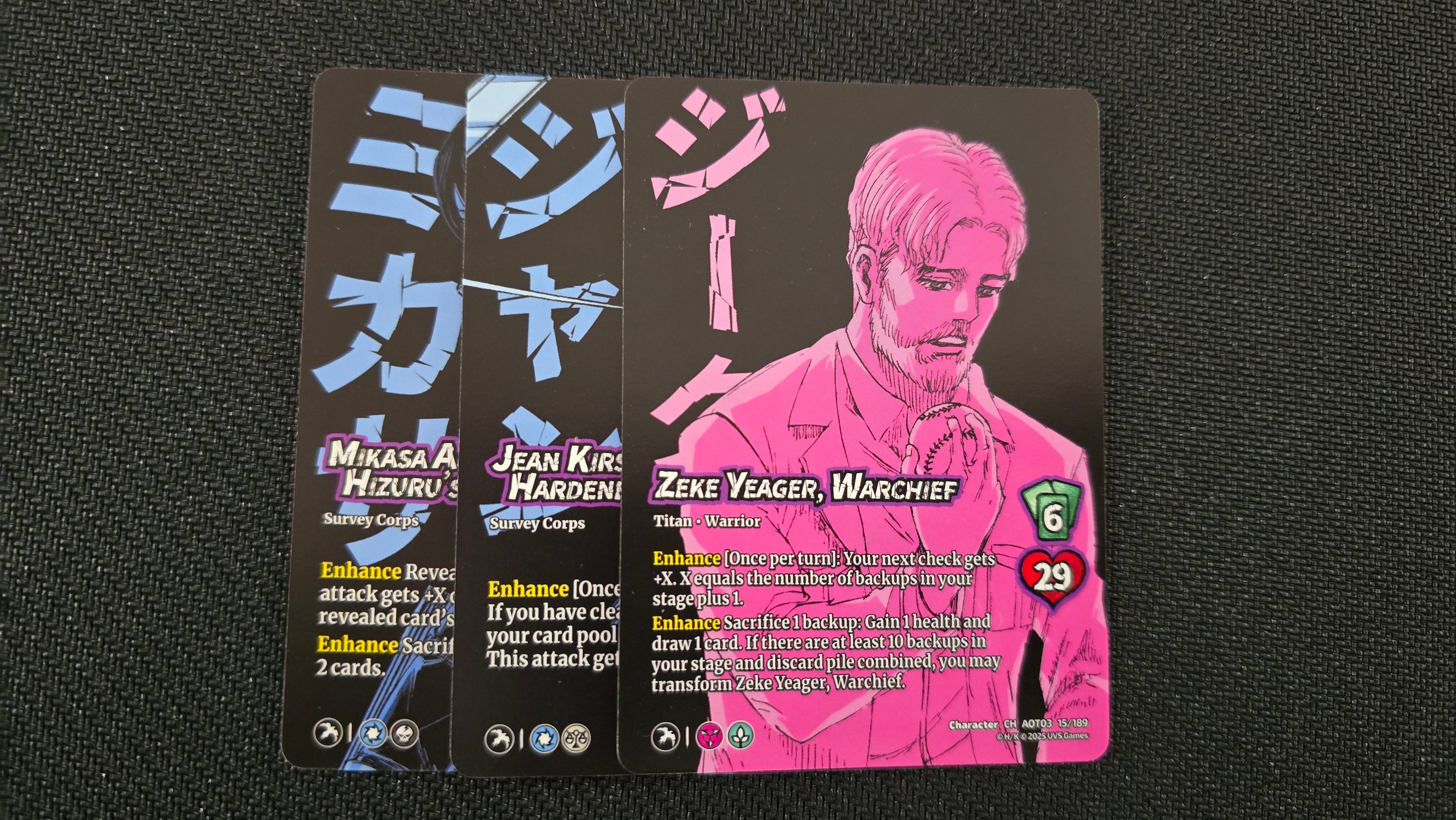 From a gameplay standpoint, not much sets Apocalypse apart from the other AoT sets UVS has released in the past year, but that isn’t really a bad thing, as I’ve enjoyed the previous sets quite a bit. I am especially fond of the double-sided Titan cards that allow characters to shift from their human form into their Titan form during the game, allowing for deeper strategies and tense moments in my games, and it feels just as good here in this final set as it did in the first. I have my fingers crossed that the team will find ways to incorporate this feature in future non-AoT sets.