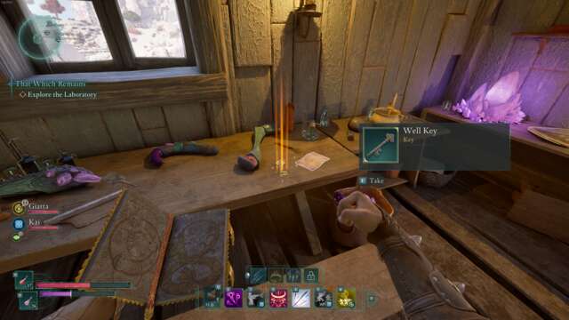 Your objective in the lab is to find the Well Key, which is sitting on a table next to a note in the back room. With the Well Key in hand, follow your map until you reach a water well that you interact with. Open the well to reveal the entrance to the Scaedclef Grotto. Head down inside to proceed with the quest.