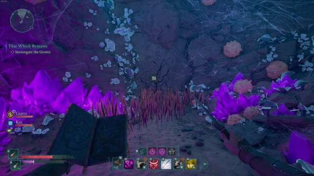 Inside the Scaedclef Grotto, your only quest objective is to explore the area. You’re given no quest markers or anything of the sort, so it can be confusing to know what to do once you get inside. In the opening room with all the purple crystals on the ground, defeat every spider enemy and then head to the back of the area near the cobwebs. On the left side of the back area, you’ll see a wall with no cobwebs on it. If you get close enough, you’ll see the wall is breakable by throwing any sort of explosive at it. The prompt for the explosive icon to appear on the wall requires you to be extremely close to it, so it’s easy to miss.