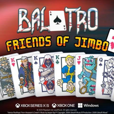 Balatro is available on Xbox Game Pass starting today! This release comes alongside the 4th “Friends of Jimbo” update, bringing exciting new collaborations with titles like Critical Role, Bugsnax, Civilization VII, RUST, Assassin’s Creed, Slay the Princess, Dead by Daylight, and Fallout.