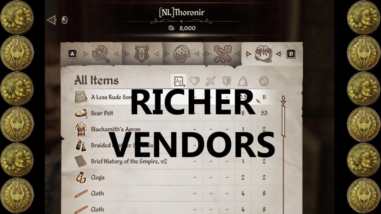 If you’ve ever gone to a merchant in Oblivion Remastered with a ton of valuable loot to sell but the vendor didn’t have enough gold to cover the sale, then the Richer Vendors mod is one you should download. This mod gives all merchants across Cyrodiil the ability to hold 10x their normal gold amount. This means all merchants will have at least 1,000 gold to spend on all of the loot you want to offer them.