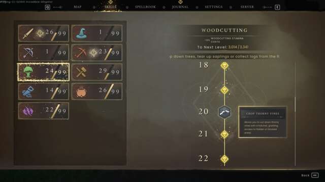 As you progress your Woodcutting skill, the stamina cost to chop is reduced, and you unlock a slew of useful spells and abilities. Perhaps the most useful spell in Dragonwilds is called Axtral Projection, which allows you to chop down one to a few trees instantly. Leveling up Woodcutting also grants you the ability to chop down Thorny Vines, which is great for exploration purposes, and unlocks a structure you can build that stores excess wood logs at your base. You need to level up Woodcutting to level 40 to unlock all of its abilities, but the max level you can reach is 49.