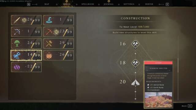 Construction has several abilities and spells that make both your base life and exploration time much simpler. For starters, a higher Construction gives you access to new materials you can use in base building. At level 18, you can start using Oak wood, which makes for a much sturdier foundation than the default Ash wood.