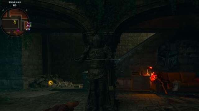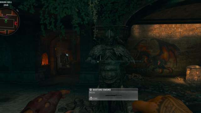 This is the Caliburn: Dragon’s Fire sword, and it’s by far the easiest sword to obtain. Take the Stamp to the Dining Hall and interact with the armored statue with a dragon on its chest plate. This gives you a Bastard sword.