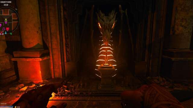 Then, run towards Speed Cold and down the ramp to the door with the lion symbol on it. Melee the door and a glowing symbol will appear. Repeat this process three more times. Melee a glowing parasite to charge the sword, and then go melee the lion door.