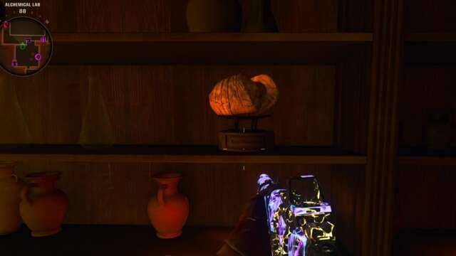 Go to the Alchemical Lab room. Each match will be different, but you’ll always have one Antiquity item that spawns in the room. It might be an ornament with two raven skulls, a jaw bone, a horn, a fish fossil, or a scorpion fossil. Each piece will have a symbol on it, but it’s hard to see and you can’t reexamine it after you pick it up. Don’t worry, we have the solutions below.