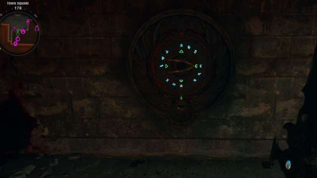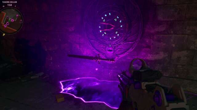 Then, take the Antiquity item back towards the spawn area. Underneath the tavern is a basement with a puzzle dial on the wall. Interacting with it will deposit your sword and place the Antiquity item in the center.