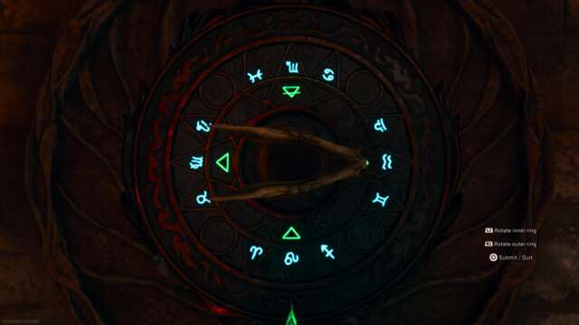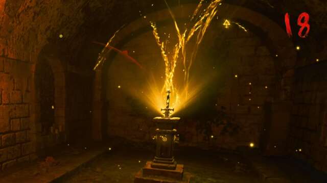 Interact with the door to be teleported inside the room. Interact with the pedestal inside to place the sword. The symbols from the door will start spawning and moving all over the room. They’ll also appear on the pedestal one by one. Shoot the symbols in the order shown on the pedestal, and repeat until you’ve done all four.