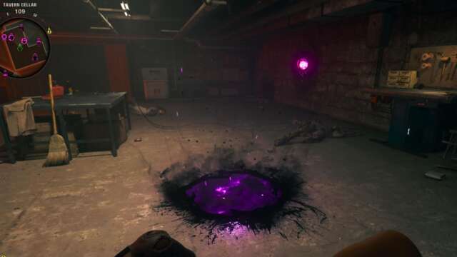 It takes a few orbs to close the portal, and then it will move to a new location inside the tavern above you. Go and stand by the portal until enough orbs can close it. The third and final portal is upstairs in the tavern. The portal is supposed to close, and then you can go pick up the upgraded sword by interacting with the dial.