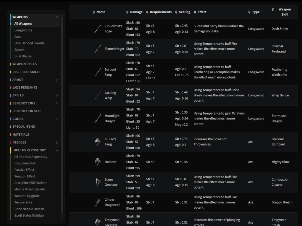 Weapons are the core of any build, the game offers five different weapon classes; Longsword, Spear, One-Handed Sword, Dual Blades, and Axe. Each weapon has a unique move set and a pool of customizable Disciplines. In addition, each weapon within a class has its own unique weapon skill.