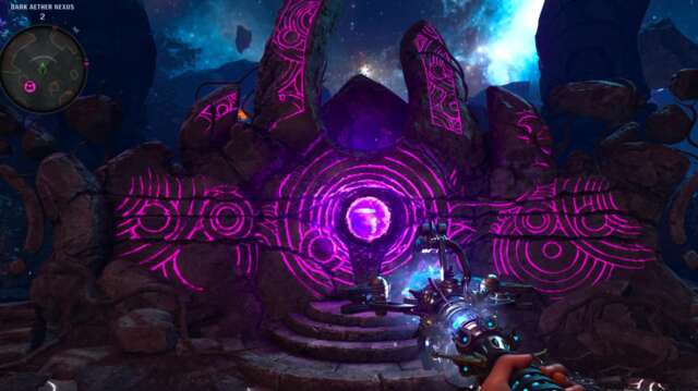 Next, head to the Dark Aether Nexus via any of the portals. Look up at the floating space rocks above you. Three of these rocks will have glowing purple runes on them.