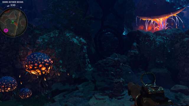 Once geared up, head into the Dark Aether Nexus. Follow the purple beams to a wall with a pedestal. Interact with the pedestal and a bride will appear.