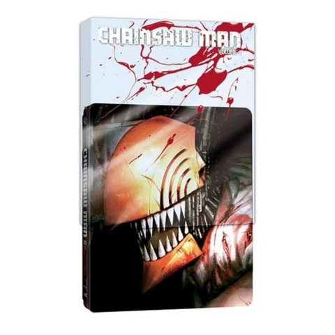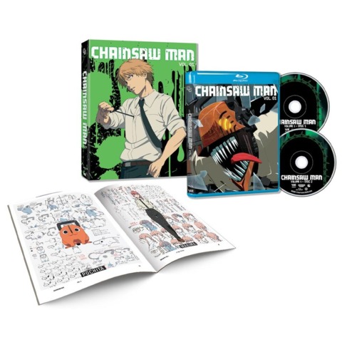 The Limited Edition comes with the same on-disc extras alongside a 72-page booklet featuring various character design illustrations from the anime. It has a regular cover featuring promotional art of Denji about to transform into the Chainsaw Devil, and a protective slipcase of Denji transformed.