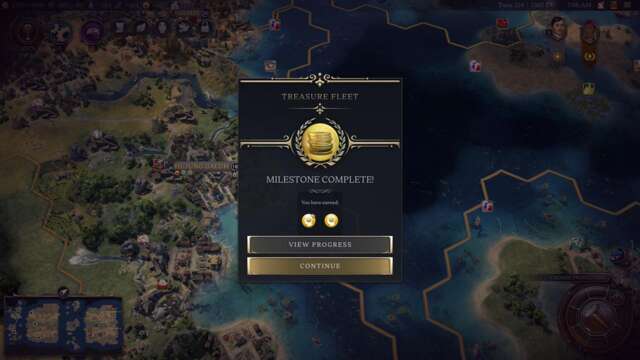 - Let’s say the progress gauge is at 90% and you’re almost done with the Economic Legacy milestone. Just click on your Treasure Fleet and park them in water tiles near your home continent.