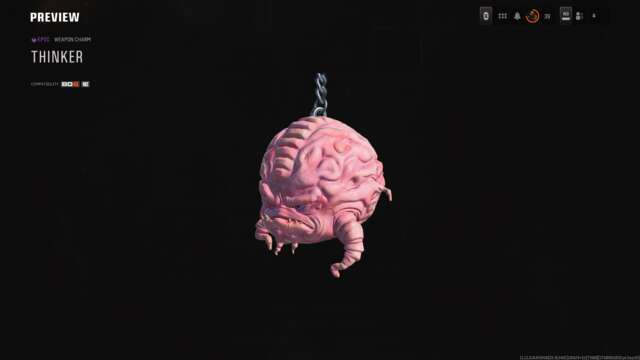 The “Thinker” weapon charm is unlocked in the free event pass at 300,000 XP earned. This is a weapon charm of Kraang, a notable villain from the TMNT franchise.