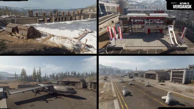 This image shows off the remake of popular locations from Verdansk. This includes Train Station, Gora Dam complex, Scrapyard (part of the Zhokov Boneyard) and Airport.