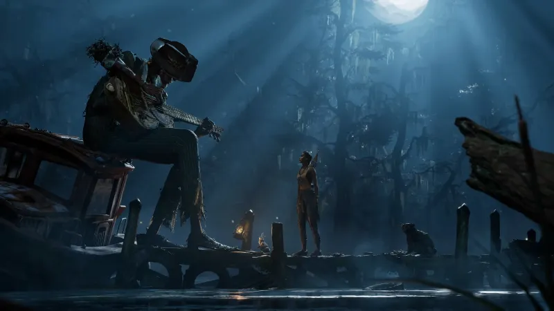 The stylish trailer begins with a strange musician strumming his guitar surrounded be forest critters in a bayou-like swamp. A young woman pays a visit to inquire about a dangerous monster, which attempts to ambush her until she retaliates by weaving a seemingly magical web to subdue it. There’s no gameplay, and the trailer’s description describes South of Heaven as a “fantastical and macabre third-person action-adventure set in the American Deep South.”