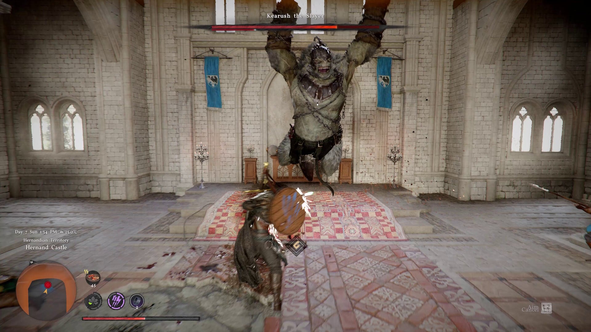 Finally, Kearush the Slayer is a monster with no less than three health bars – a fight-extending trick that multiple foes across Crimson Desert’s campaign can pull. There’s a Hulk-like intensity to this fight, with Kearush being able to climb the walls and unleash clumsy-but-destructive leaps in his attempt to turn every bone in your body to dust. As a larger creature, you’re able to clamber onto his back and stab away, Dragon’s Dogma-style, but be careful – he’s more than happy to fall back-first from a great height, so let go of those shoulders before you’re forced to cushion his landing.