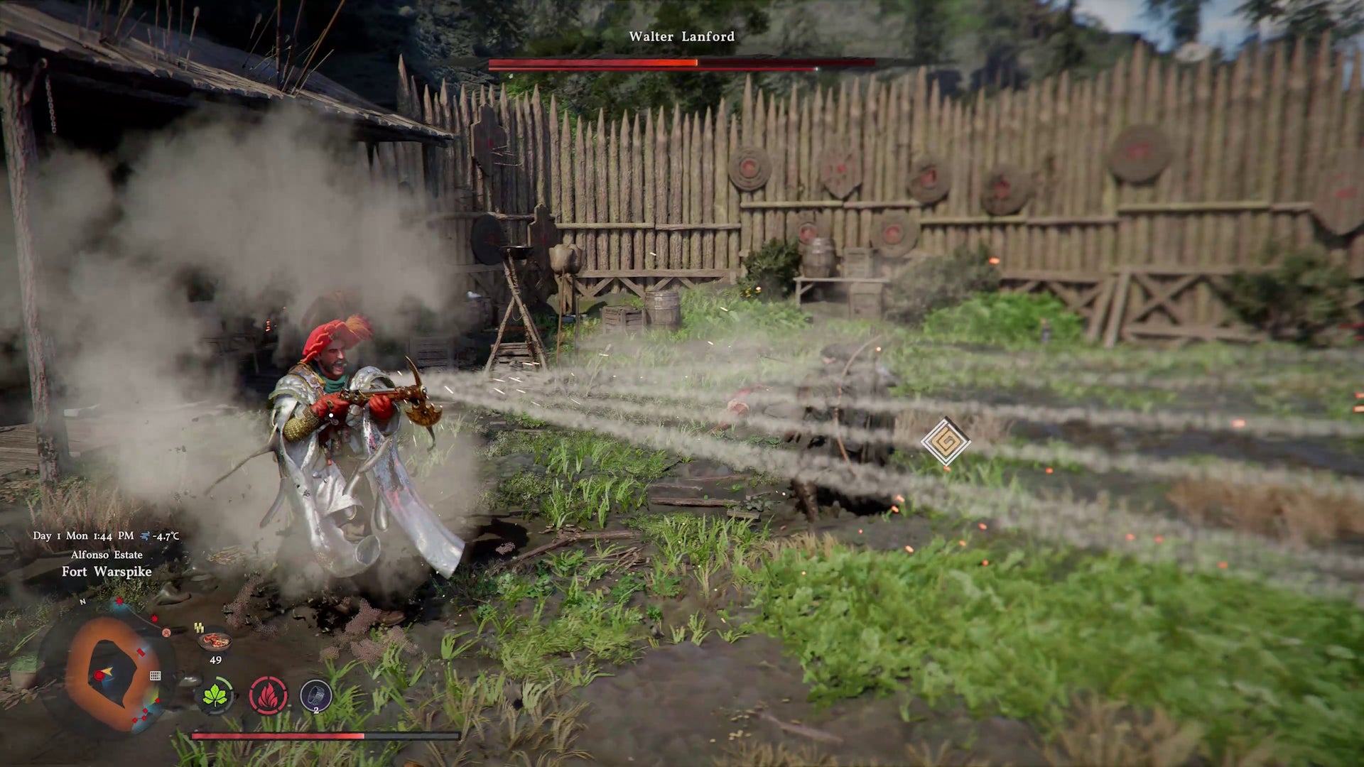 Walter Landford may be no bigger than you are, but he’s arguably the most sophisticated of the three bosses we’re showing today. Armed with a shotgun, he’s able to fight effectively at range. Dodging the wide-spread projectiles is key, but get your timing right and you can actually deflect his blasts back at him. Should your reflexes not be quite that sharp, you can spin up a magic barrier that collects incoming bullets and fires them back where they came from. Walter’s weak to grapples, so getting in close is vital – thankfully you can use the “deflect light” skill, typically used to find hidden items, to temporarily blind him and close the distance. You’ll need to act fast, though, as Walter’s armed with smoke grenades that can help conceal his rapid getaways.