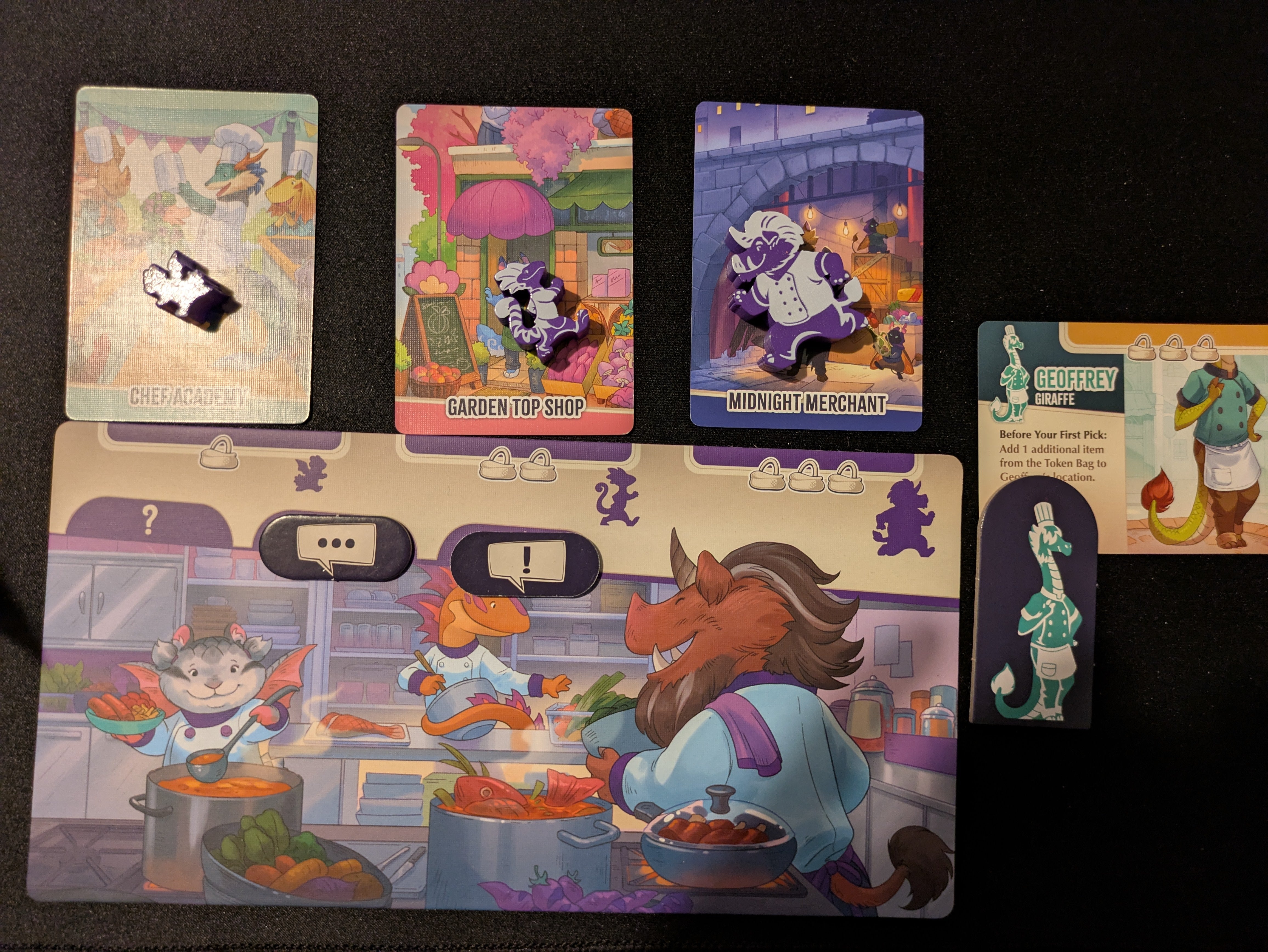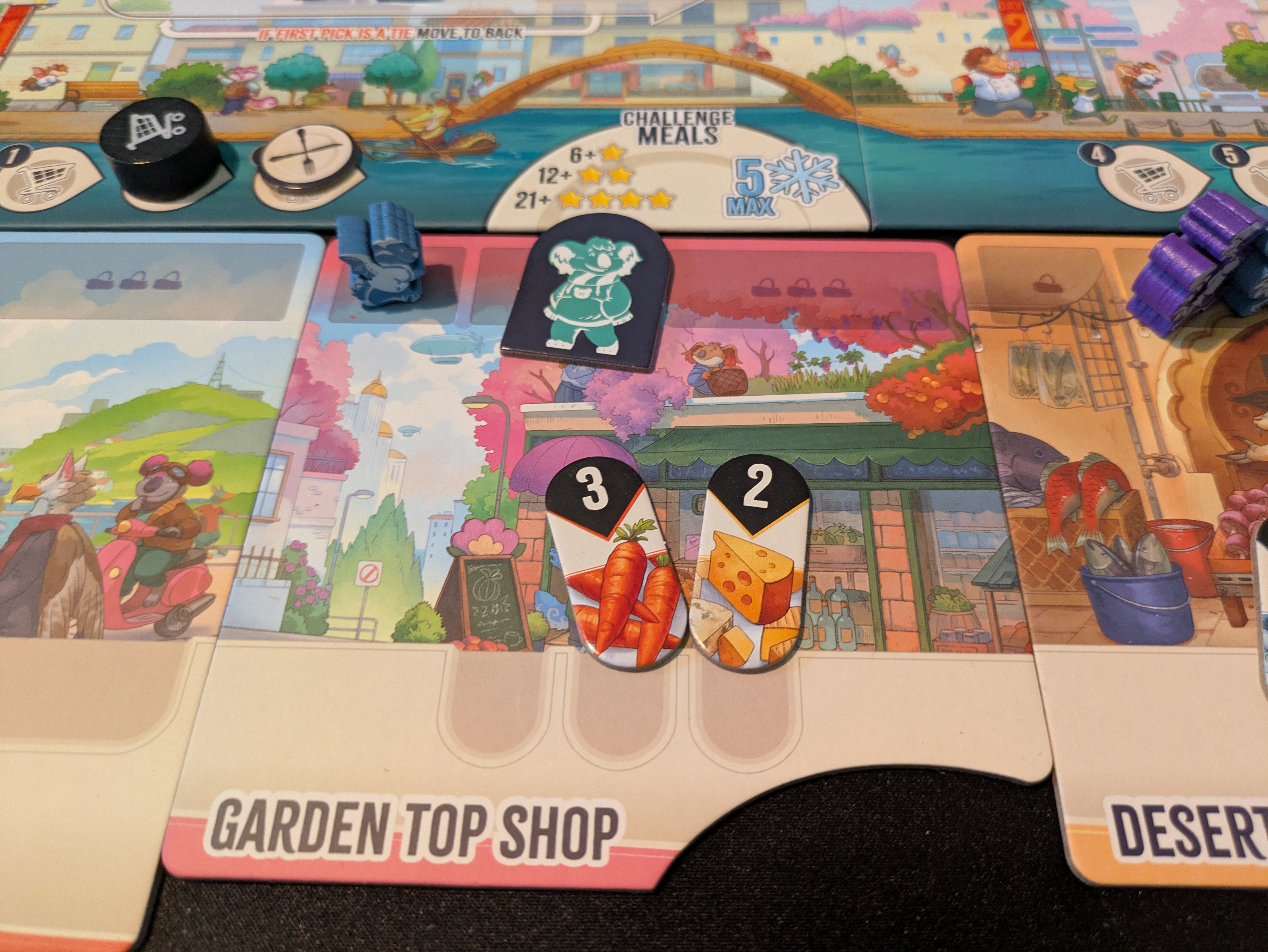 This phase of play is an absolute riot. Shops generally only have three items available, so if a 1-value chef and a 3-value chef get assigned to the same shop, the 1-value chef gets first pick of the stock, and the 3-value chef only gets to take two items home. In a crowded field, or if one of the shops has a particularly tasty draw, this means there’s a real risk of a higher value chef going home empty handed although they get a consolation soup – a 1-value ingredient that can be used as a wildcard in place of any other – instead.