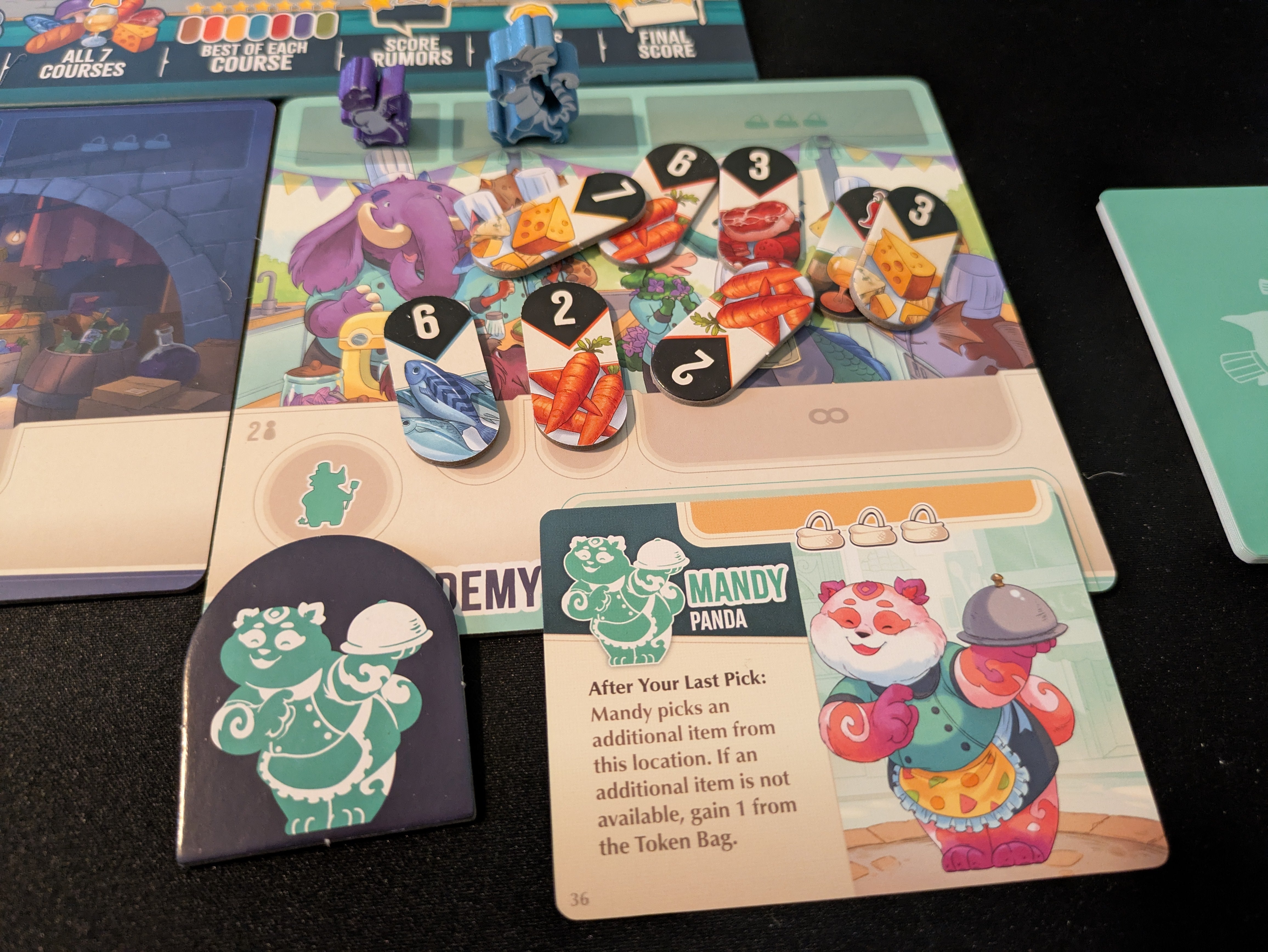 Beneath the main board there are boards for the different locations you can visit, which vary with the number of players. Each player also gets a deck of matching location cards, three cardboard plates, and a big critic’s plate, as well as a player screen behind which they can hide their growing stack of ingredient tokens. There are a lot of these, all of which must be punched out and stored in the provided drawstring bag, from which they’re pulled and assigned to locations during play. The final location, The Chef Academy, also has an associated deck of additional chefs for hire, each of which comes with a punch-out token to represent them in play.
