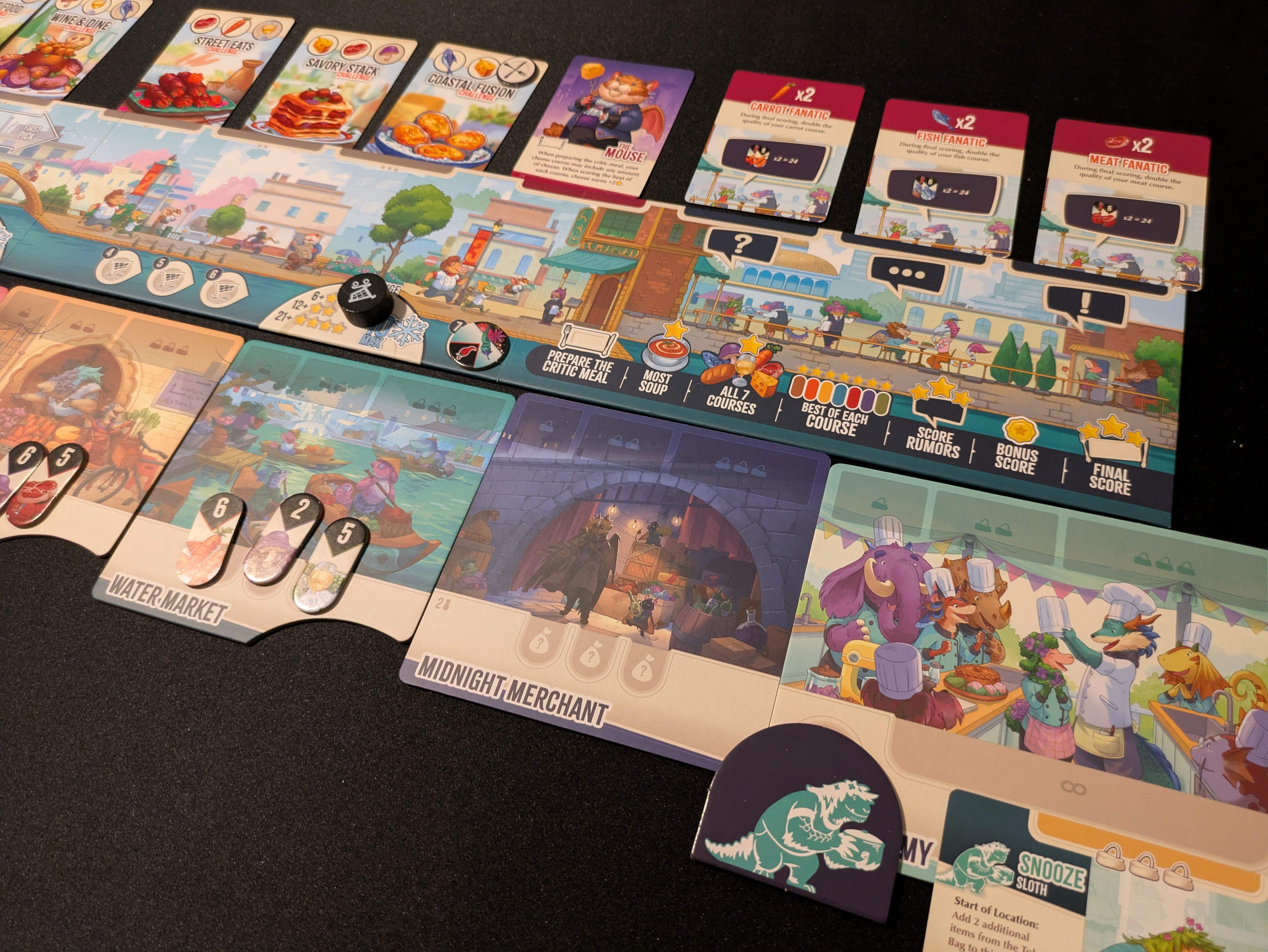 Scoring rounds take a little while, as everyone figures out what ingredients they want to use, but other than that the game ticks along at a very pleasing pace because of the way your chef locations are decided simultaneously. And despite the apparent chaos of this round, it manages to strike a balance between strategy and excitement: you’ll be rewarded for prioritizing well just as much as you’ll be thwarted by failing at mind-games and second-guessing your opponents. Similarly, the slow reveal of objectives and rumors can sometimes feel frustratingly random, but really helps to keep up the tension and tempo of play.