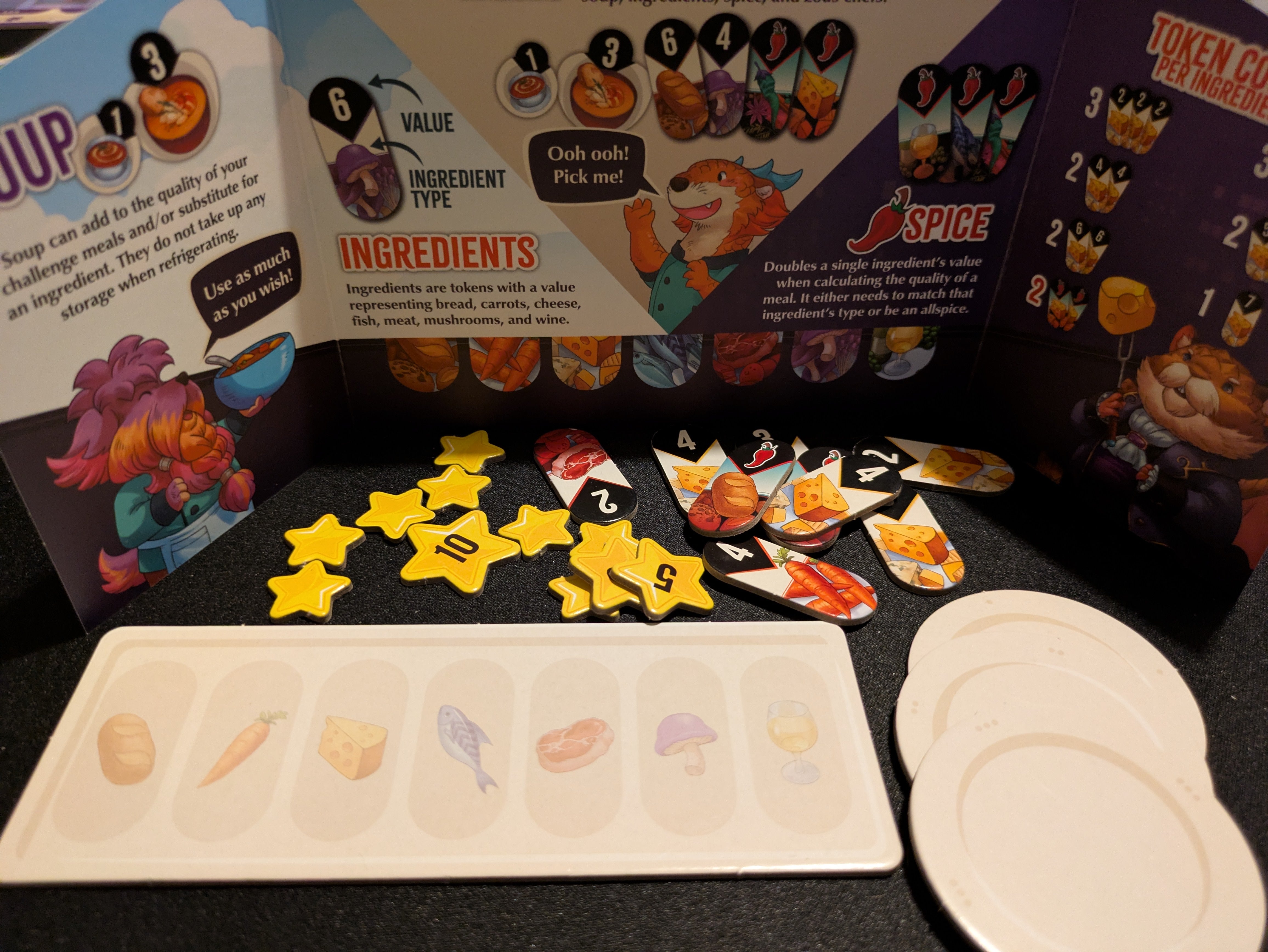 Wooden pieces come in the form of three chef tokens for each player, cut and printed to resemble the animals they represent, a mouse, lizard and boar respectively, alongside a chef’s hat token to use on the priority track.