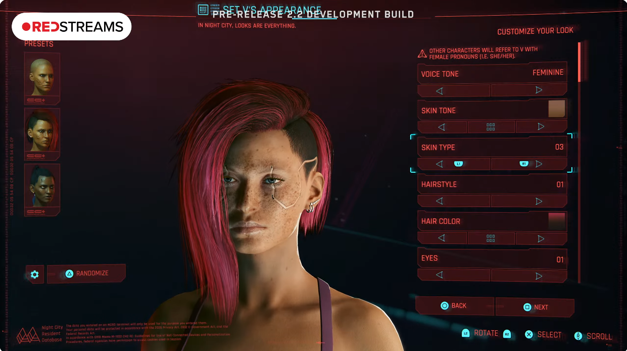 Moving on to the character creator, there are 112 new assets available for customization of V. Eight new face plates are available, so you can make your character look like they’re a member of The Mox if you’d like. New nail and even lip designs are in there, too, lifted from the various corporations in Cyberpunk 2077, and loads of new eyes (including double eyes). There’s a new randomizer, too, with a ‘plain to punk’ slider to influence what it might spit out. You can lock specific assets, too, then continue with the randomizer.