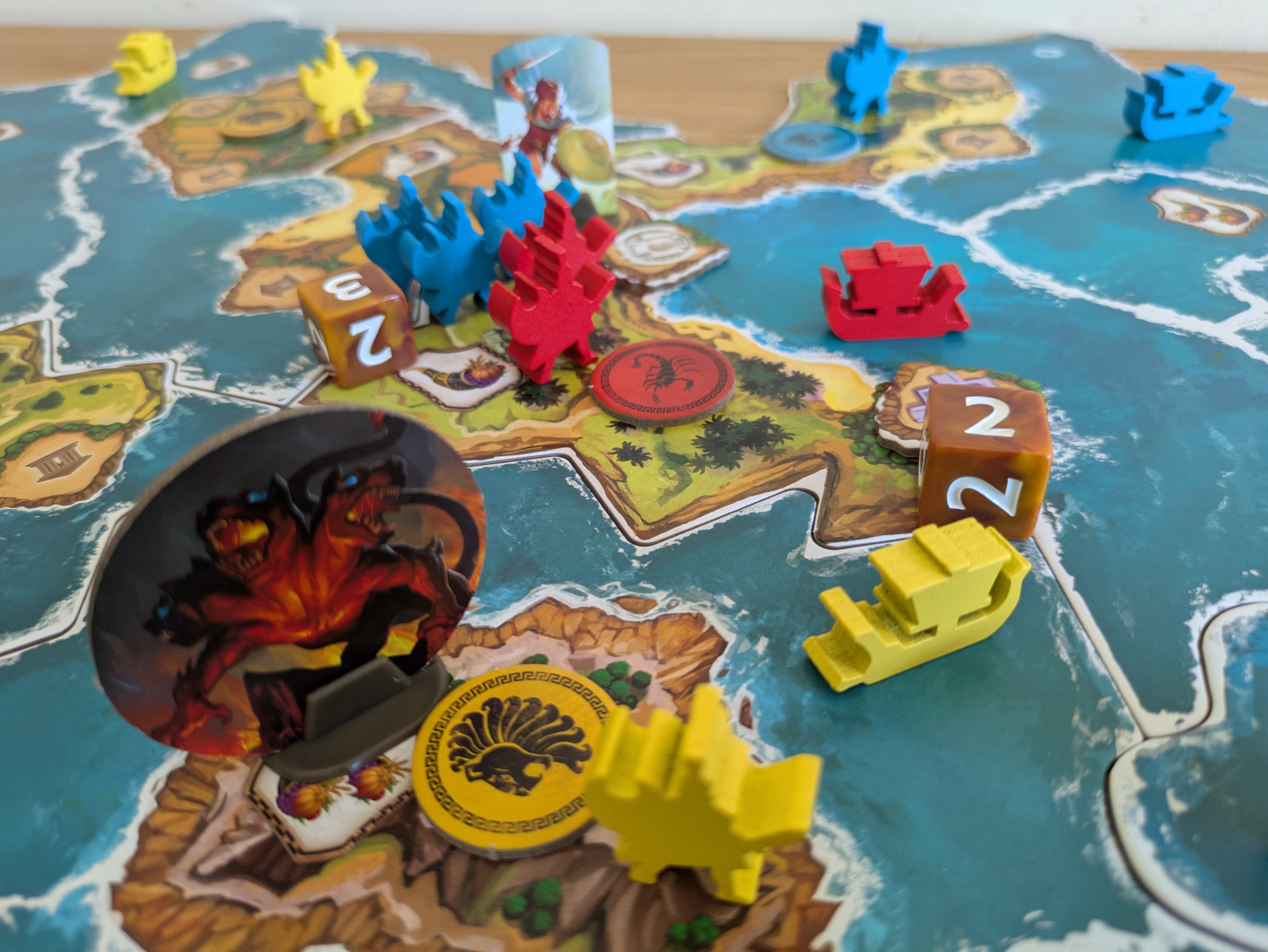 Either approach can really benefit from mythological creatures, which you can purchase with any god other than Apollo, but more peaceable players are more likely to be able to afford them. They’re pretty powerful and so work as an effective balance against big bids on warlike gods. Most are one-shot effects, like the Satyr who lets you steal a philosopher from another player, or the Harpy, who destroys an army. Others, however, get a piece on the board which you can keep and move from turn to turn if you’re willing to sacrifice priestesses, gained by winning the auction for Zeus. These include horrors like the kraken, who simply wipes out all fleets in whatever space it enters. Pushing these beasts around the map is enormous fun, so long as you can afford the priestesses to do so.