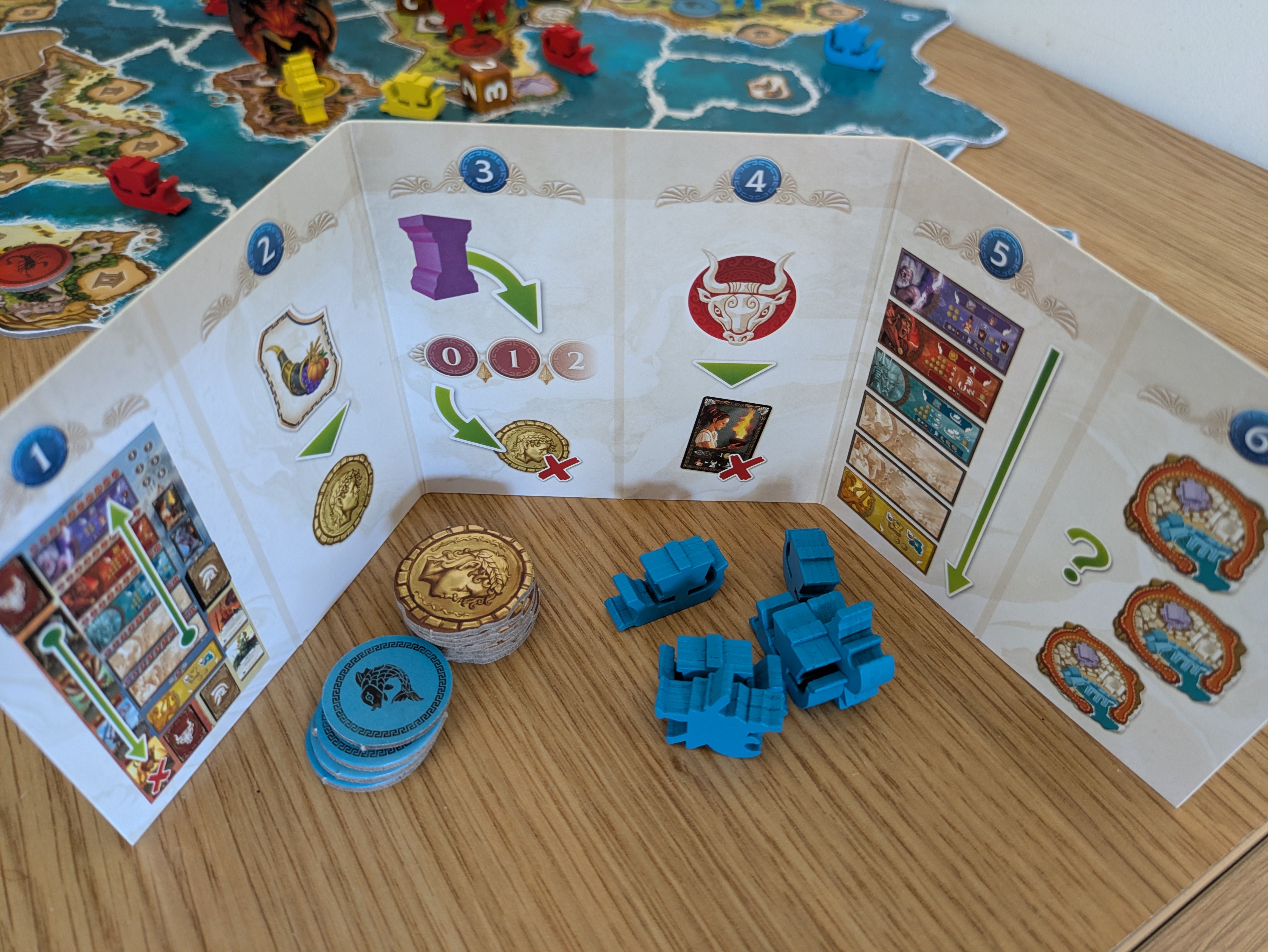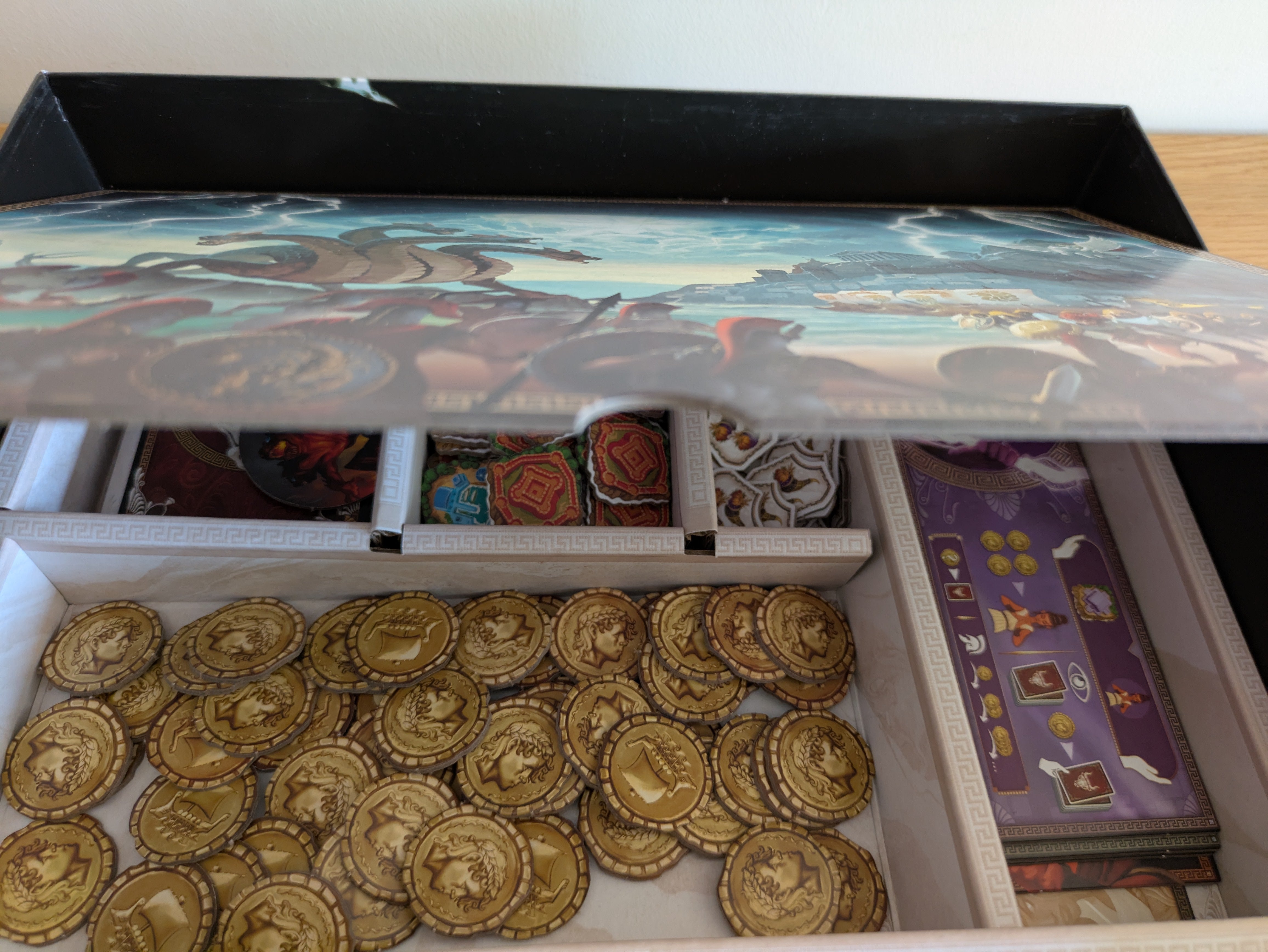 There are punch-out cardboard strips to represent the gods, while the heroes and monsters get a deck of cards each, plus cardboard standees for those that move around the map. Other punch-out tokens include various buildings and upgrades for the map, plus a horde of cardboard coins. Most of this gets tucked away neatly in a treasure-chest like box insert with a flip-up lid, a smart extra design feature to help you organize and pack away the game.