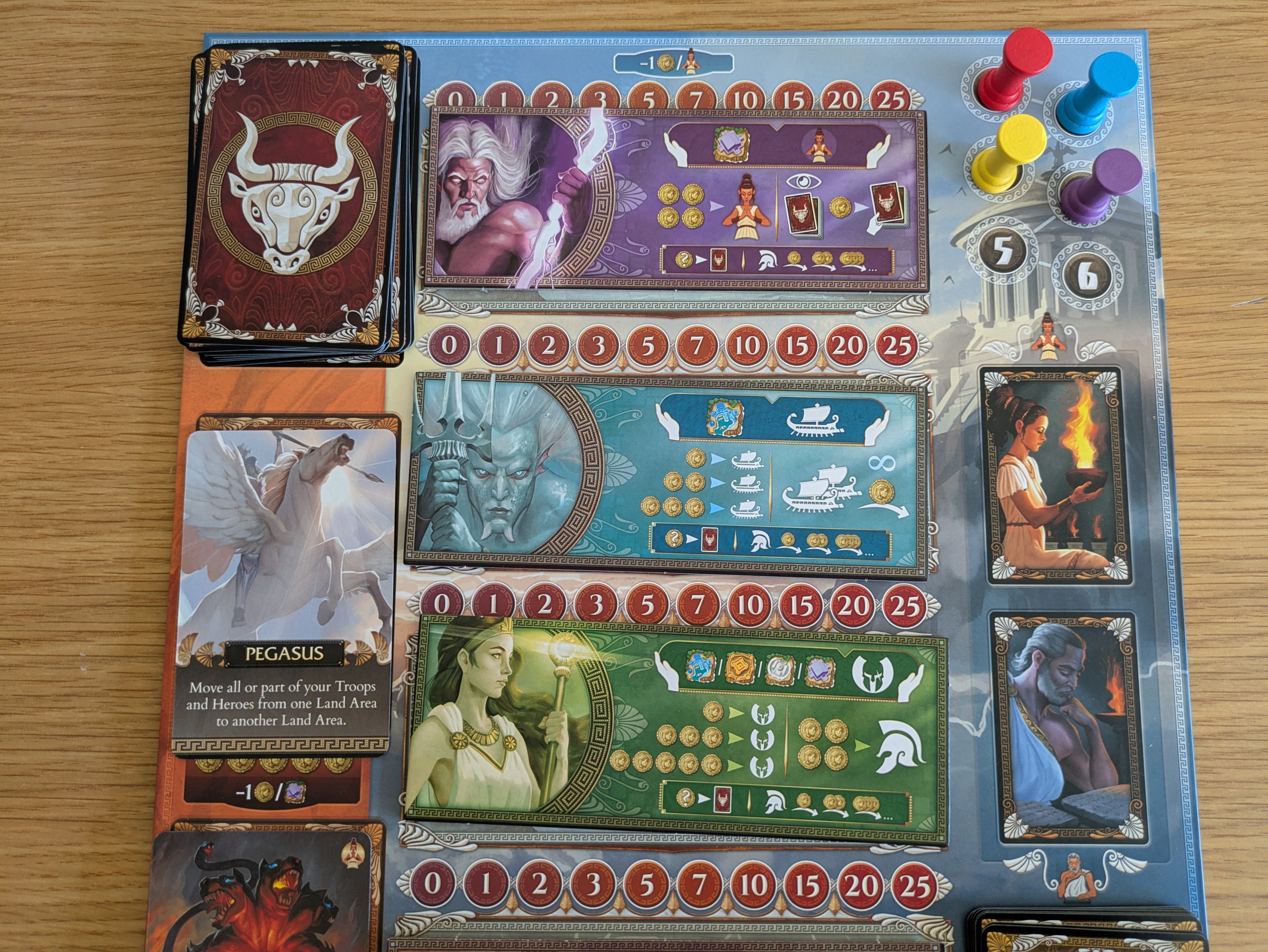 All of this means competition in the bidding can be intense, depending on the board situation, with winning or losing a particular god having a huge impact on the game state. It’s a fraught, exciting auction when there’s a lot riding on a turn, with various other considerations feeding into the bids. Sometimes it’s worth trying to outbid an opponent just to keep yourself safe from a land or sea attack. Sometimes it’s worth leaving yourself short-changed in terms of paying for actions just to corner a particular deity. It’s a dynamic phase, with plenty of interaction.