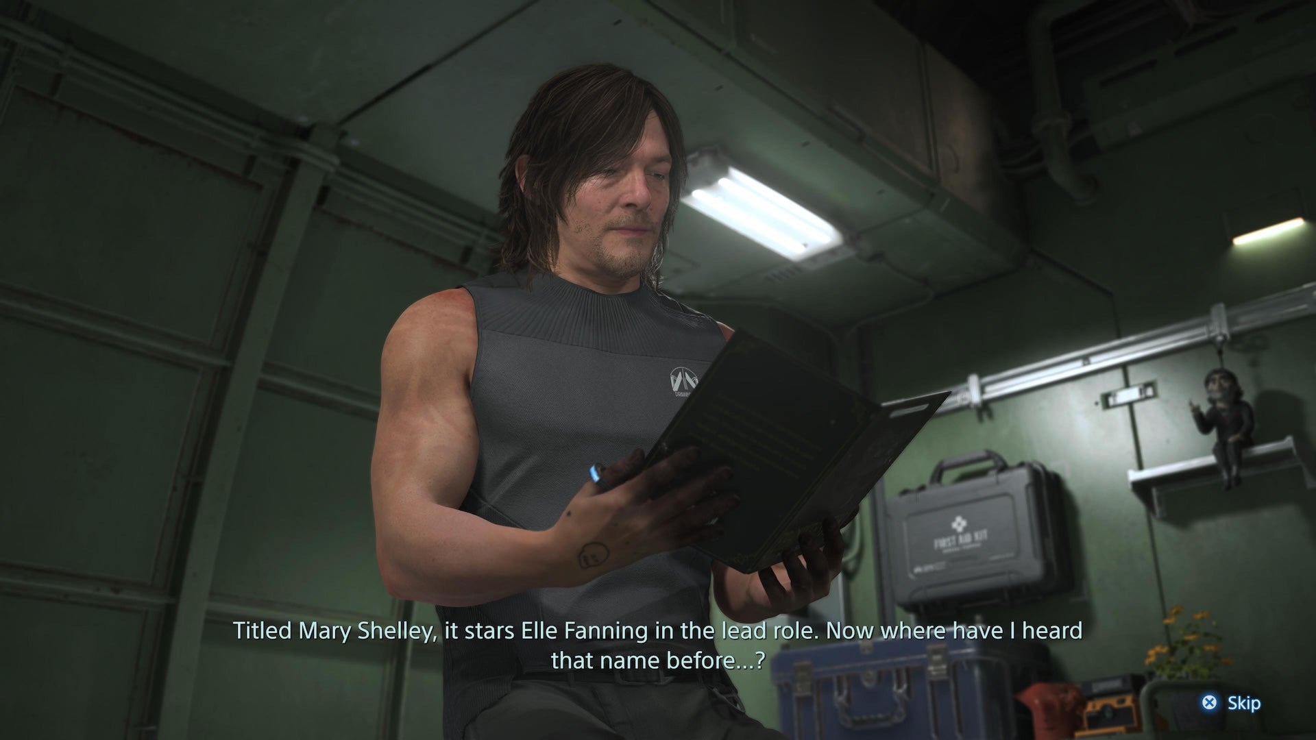 43. Sam is also apparently an avid reader given the stack of books in his cabin. If you pick up a copy of Frankenstein, Dollman will mention a movie about the fictional doctor starring Elle Fanning, the actor of Tomorrow.
