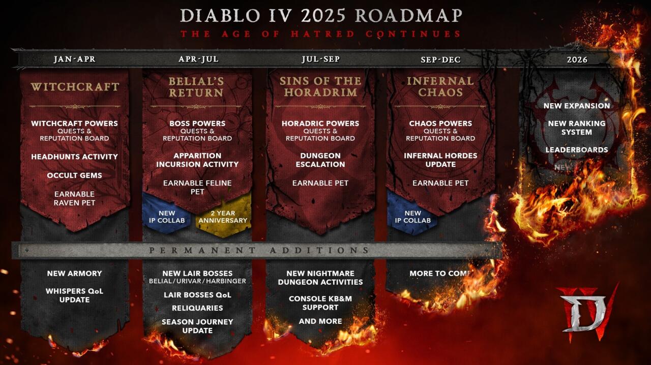 Diablo 4 will receive three more seasons in 2025, ones that will introduce new seasonal powers and improvements to endgame activities like Nightmare dungeons and the Infernal Hordes.