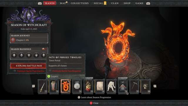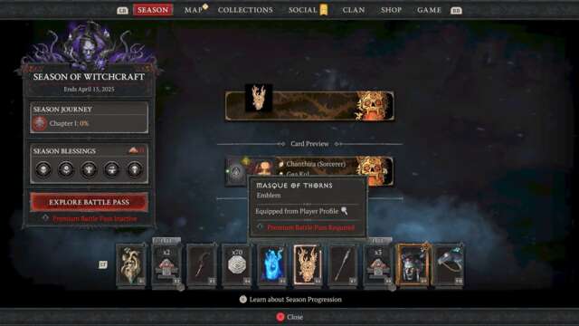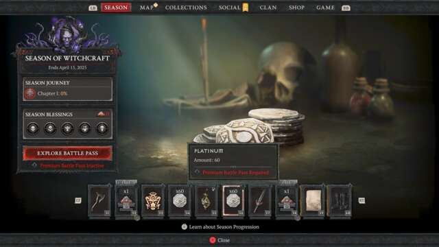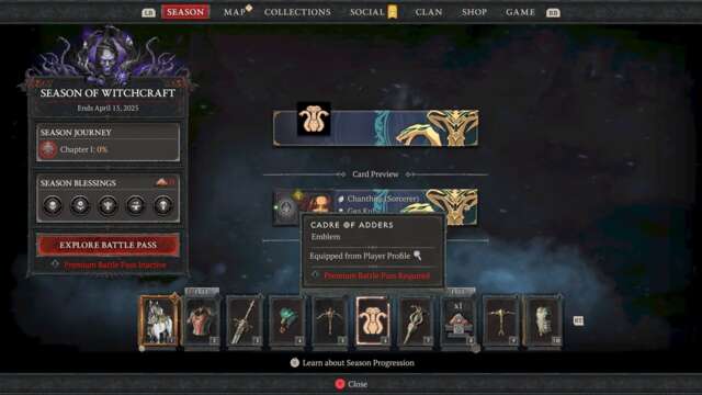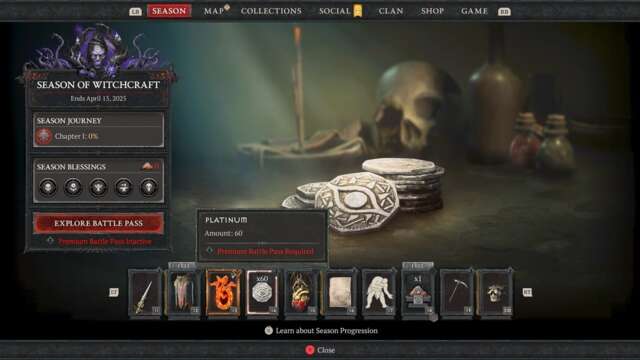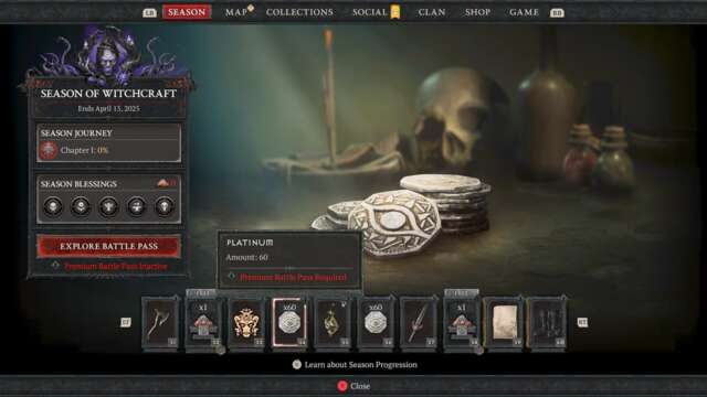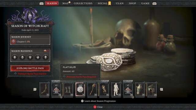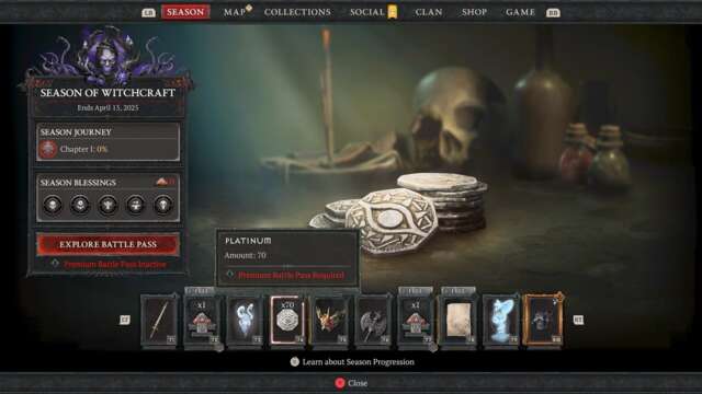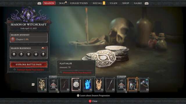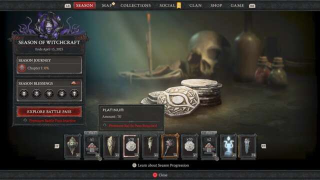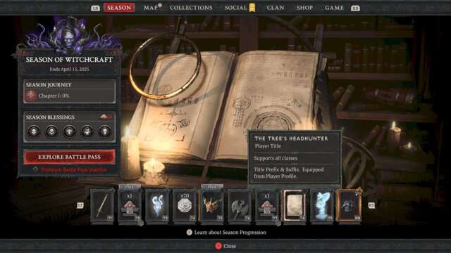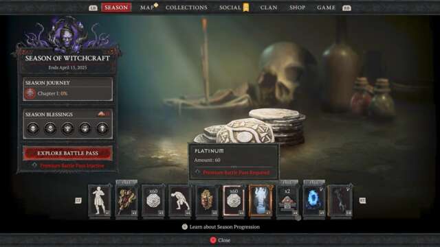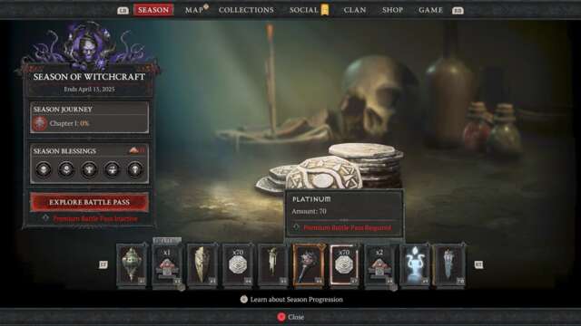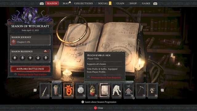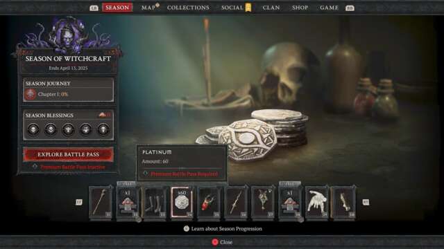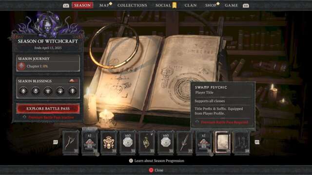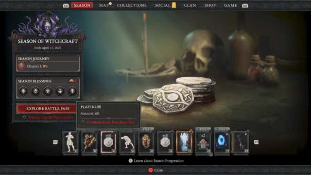 Season 7 also adds a new battle pass, with 90 tiers of free and premium rewards to unlock over the course of the season. To match the season theme, the premium battle pass includes two cosmetic armor sets for all classes, the High Witch and Exalted Witch cosmetic sets. It also includes 19 weapon cosmetics, two town portals, two mounts and mount armors, and an emote for the five original classes, sorry Spiritborn players. To progress through the battle pass you just need to play the new season, although completing Season Journey tasks will reward you with more battle pass XP faster.