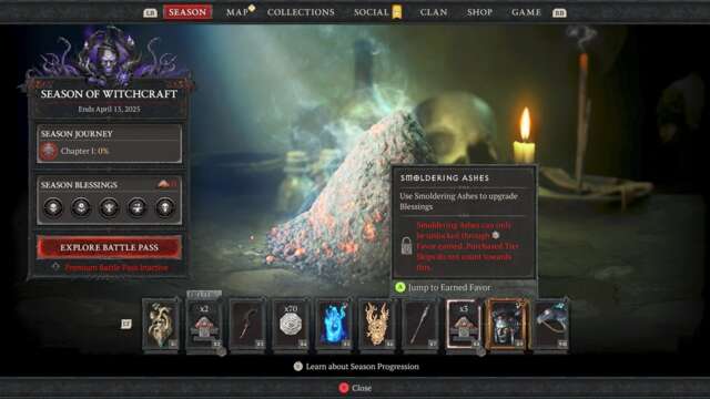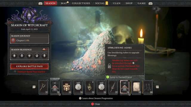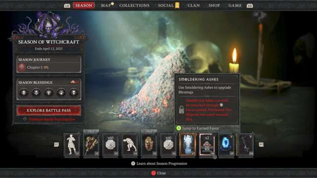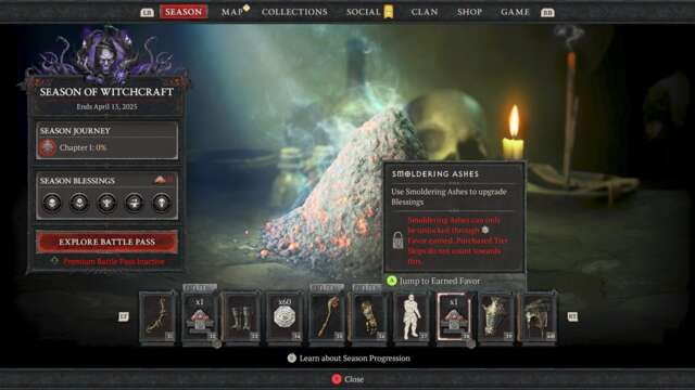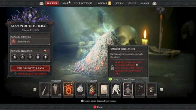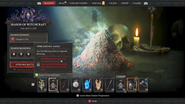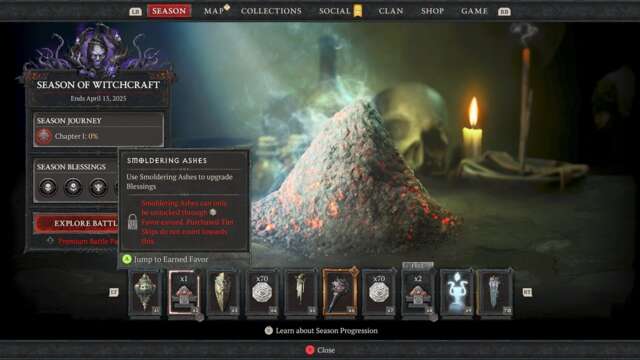 The premium version of the battle pass costs 1,000 Silver ($10 USD), but it does include 700 across the 90 tiers of unlocks. There is also an accelerated version for 2,800 Silver ($28 USD), which includes 20 tier skips and the exclusive Magic of Mushrooms emote for all classes. The battle pass is primary cosmetics, but it does include one gameplay-focused element, which is available in both the free version and paid version, Smoldering Ashes. Smoldering Ashes are used to get seasonal blessings which include simple boosts like extra monster XP or new seasonal ones like an increased drop rate for seasonal power upgrade materials.