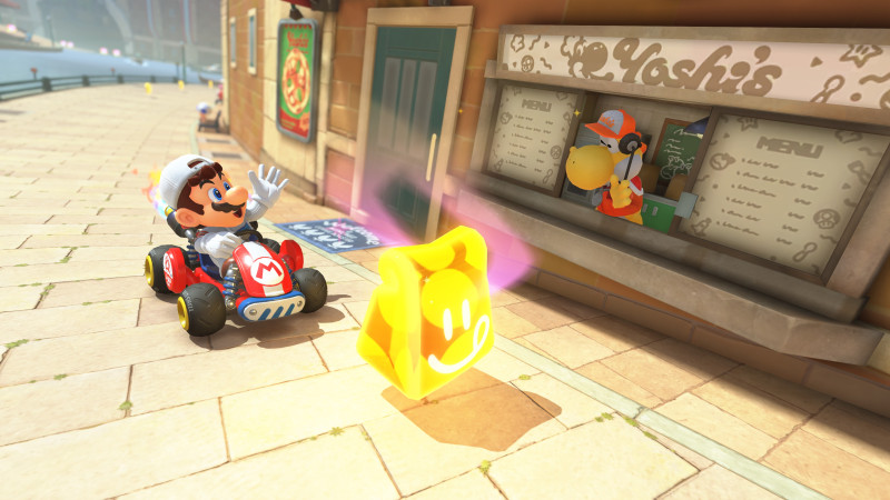 The other major new item only appears in Mario Kart World’s Free Roam mode, which allows players to explore the world to their heart’s content. Along the way, you can grab Dash Food, little bags of to-go orders, from restaurants to change your character’s outfit. Each outfit matches the locale the food is found in, and remains permanently unlocked in every mode, so you’re incentivized to take your favorite character on a road trip and explore as much as you can.