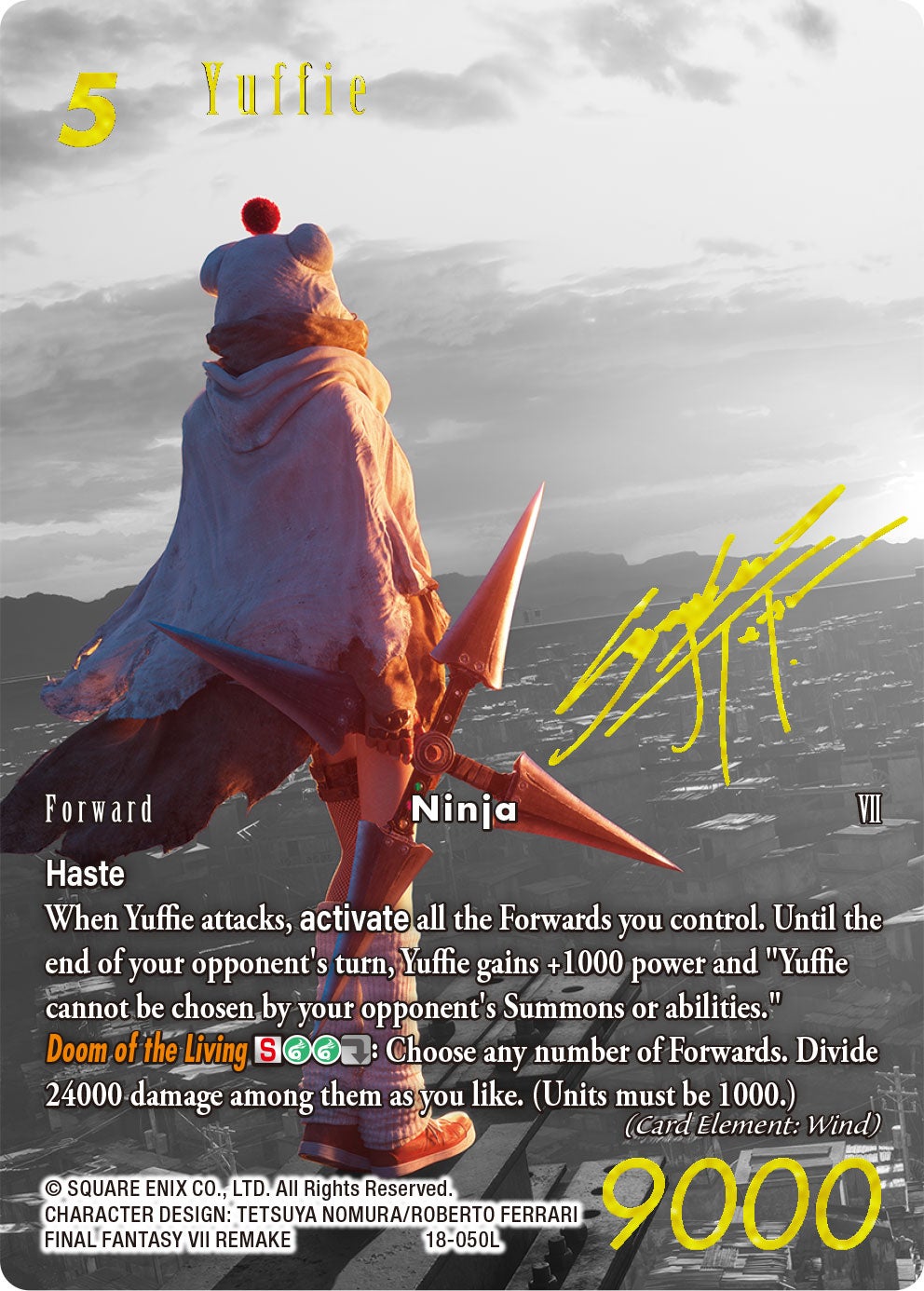 The three variants are from Final Fantasy 7 including Aerith, Sephiroth, and Cloud. Some of these new cards include variants featuring the iconic art of Yoshitaka Amano. In addition, the upcoming set is introducing a new type of rare collectible card, the Special Card. For the Final Fantasy 7 25th Anniversary Celebration, the new Special Card will be a Full Art Foil Yuffie with a gold stamped signature from Tetsuya Nomura. Here’s a closer look: