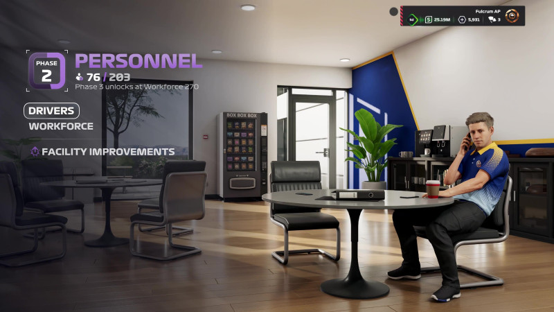 As you play through various races, you can improve your Fan Rating, the sentiment surrounding the team, based on how you perform in team versus team rivalries. In between races, you spend your time in Team HQ, which has also been upgraded for this entry. The updated facilities structure brings a more granular upgrade system and a workforce size management element where you have to balance the benefits of having a large support staff versus the cost of having so many folks on your team.